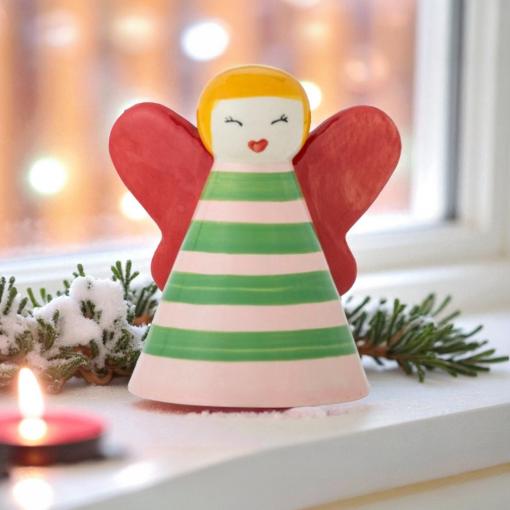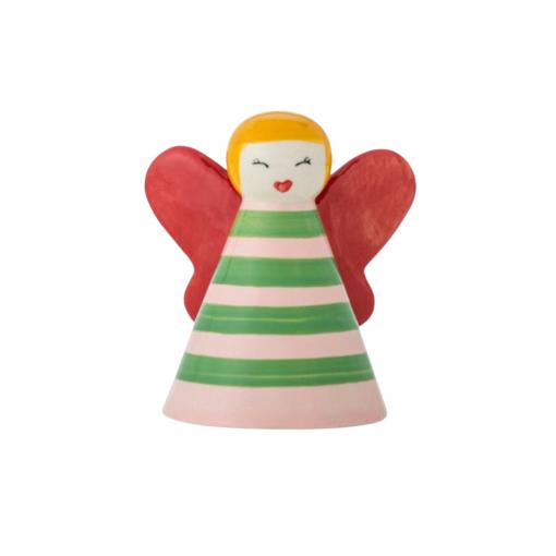 Apportez une touche de joie et de couleur à votre intérieur avec cet adorable ange de la collection Caramella signée Bloomingville. Fabriqué en grès peint à la main, il séduit par ses tons frais de vert et rose, ses ailes rouges et ses cheveux dorés. Son sourire délicat et son design épuré créent une atmosphère douce et joyeuse, parfaite pour la période des fêtes ou pour égayer la maison toute l’année.