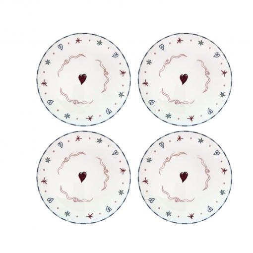 Ce set de 4 assiettes séduit par son univers délicat et poétique. Au centre, un cœur dessiné à la main apporte une touche tendre, tandis que les motifs qui l’entourent évoquent les étoiles, le mouvement et la légèreté. Chaque assiette devient ainsi une petite œuvre à part entière.