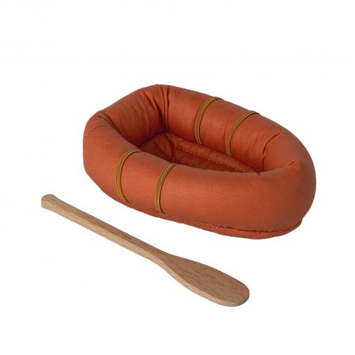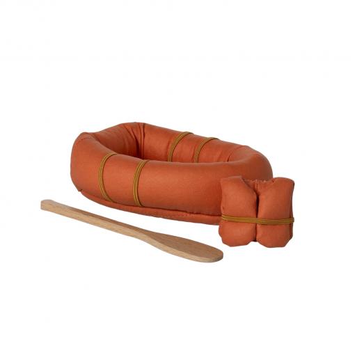 Ce petit bateau pneumatique miniature, en tissu, est livré avec un gilet de sauvetage et une pagaie, pour partir à l’aventure en toute imagination.