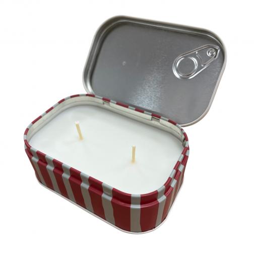 Présentée dans une boîte métallique au style original, rappelant les conserves vintage avec sa languette décorative, cette bougie apporte une touche à la fois ludique et élégante. Ses deux mèches offrent une diffusion homogène et une lumière chaleureuse, idéale pour créer une ambiance conviviale.