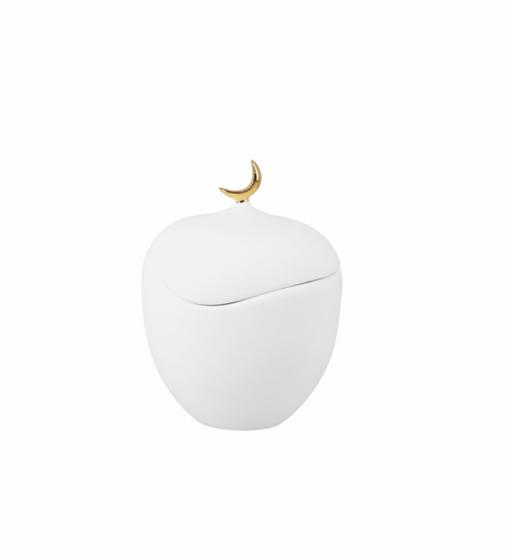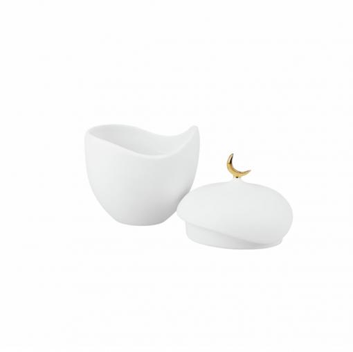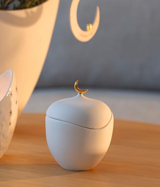 Délicate et pleine de douceur, cette boîte en porcelaine blanche mate est surmontée d’un fin croissant de lune doré.