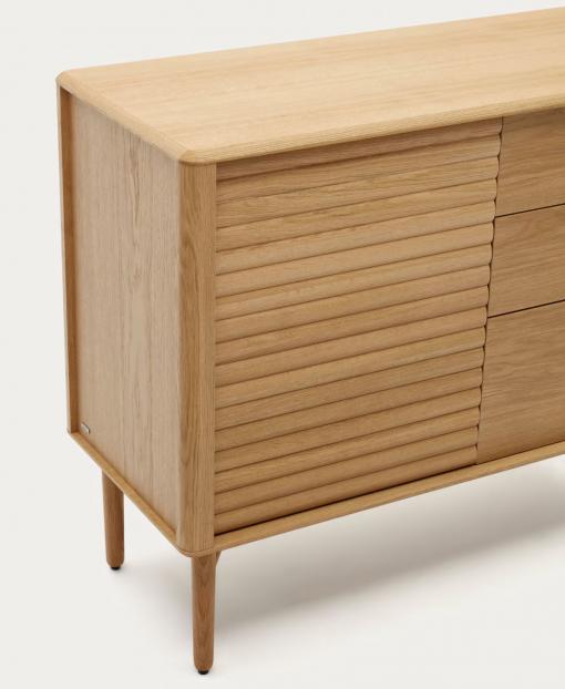 Ce buffet en bois et placage de chêne offre un design unique, caractérisé par des coins arrondis et des reliefs subtils sur ses portes. Pratique et élégant, il dispose d'une porte et de trois tiroirs à ouverture à pression pour un rangement efficace. De plus, le bois utilisé provient de forêts durables avec une exploitation responsable, et sa fabrication est locale, garantissant ainsi un produit écologique et de qualité.