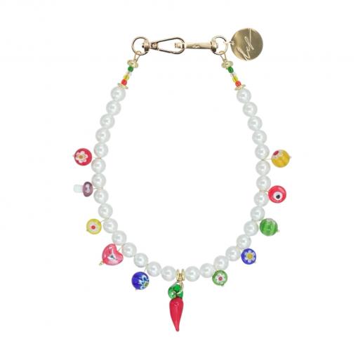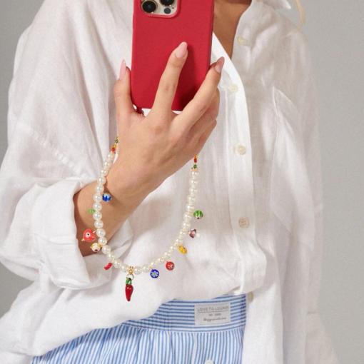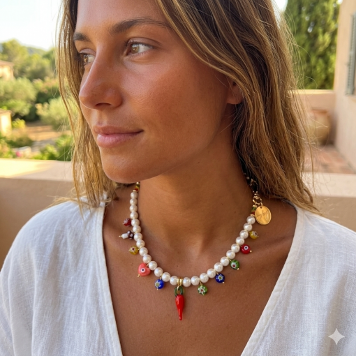 Apportez une touche solaire et joyeuse à votre quotidien avec ce collier en perles signé La Coque Française, également pensé comme une chaîne de téléphone élégante. Orné de charms colorés et symboliques – œil protecteur, cœur, fleurs et piment – il incarne un esprit méditerranéen, à la fois ludique et raffiné.