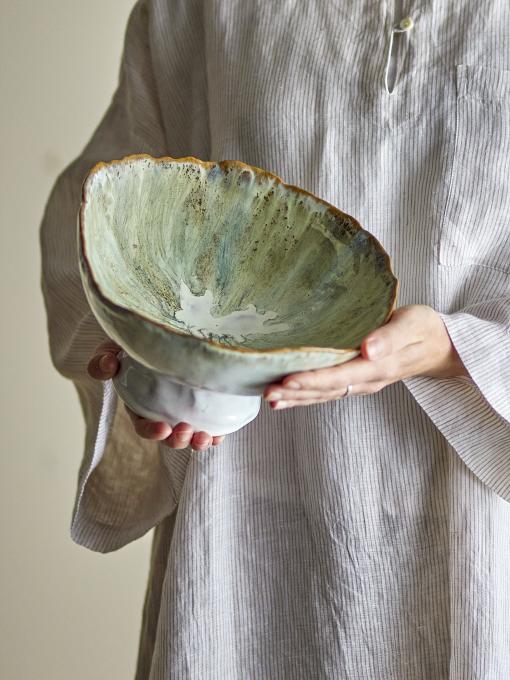Le bol Joby se distingue par son grès sublimé d’une glaçure réactive aux nuances de bleu et de vert, créant des variations subtiles et uniques. Posé sur un petit pied, il gagne en légèreté visuelle et se prête aussi bien à la présentation de fruits qu’à un usage décoratif. Son esthétique sobre et d’inspiration nordique lui permet de s’intégrer harmonieusement dans tous les intérieurs, tandis que chaque pièce révèle un caractère singulier, façonné par la glaçure.