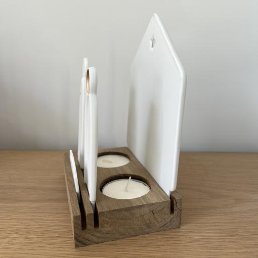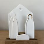 Cette crèche en porcelaine est une œuvre délicate, avec un décor minutieusement intégré dans son socle en bois. Elle offre une touche chaleureuse et fonctionnelle grâce à ses deux emplacements pour insérer des chauffe-plats, créant ainsi une ambiance douce et accueillante. Chaque détail de cette pièce allie l'élégance de la porcelaine à la praticité du bois pour une expérience visuelle et fonctionnelle unique.