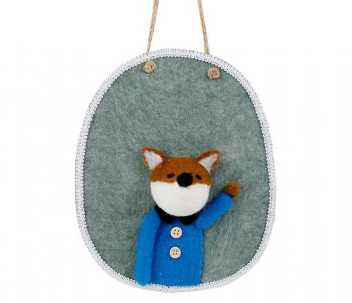 Apportez une touche ludique et chaleureuse à la chambre des enfants ou à votre intérieur avec cette décoration murale en feutre. Elle représente un adorable renard habillé d’un manteau bleu sur un fond vert tendre, entouré d’un galon blanc. Conçue en polyester et laine, elle allie douceur et aspect artisanal.