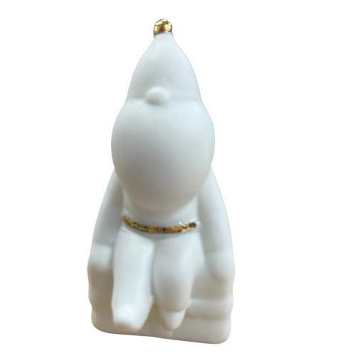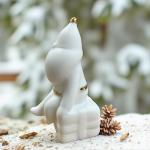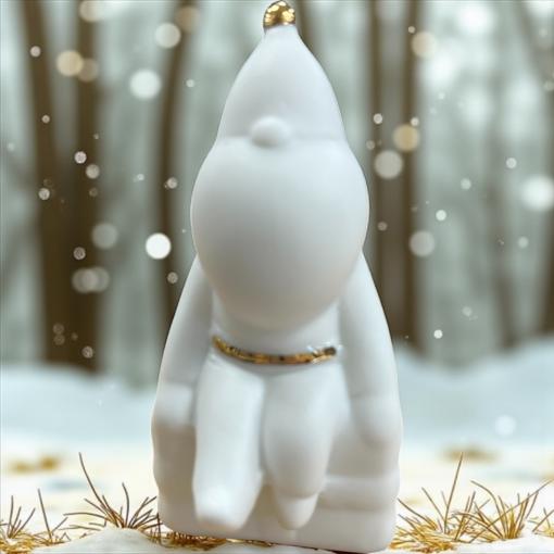 Avec son bonnet doré et sa fine ceinture scintillante, il apporte une touche d’élégance et de pureté à la tradition de Noël.