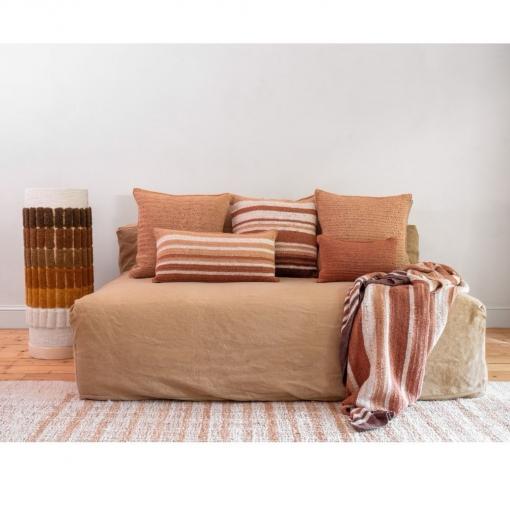 La housse de coussin TIERRA révèle toute la richesse du crochet réalisé à la main, reflet d’un savoir-faire artisanal authentique. Confectionnée en coton, elle offre une texture douce et naturelle qui réchauffe instantanément votre intérieur. Son coloris Cusco, inspiré du thème Tierra del Sol, associe des nuances chaleureuses et lumineuses pour une touche décorative pleine de caractère. Chaque pièce étant fabriquée artisanalement, de subtiles variations rendent chaque housse unique.