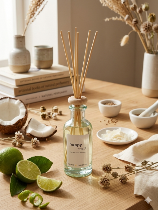 Présenté dans un élégant flacon en verre recyclé et recyclable, le mikado Happy Coco s’inscrit dans une démarche responsable. Une création vegan et zéro déchet, idéale pour parfumer votre maison avec style et conscience.