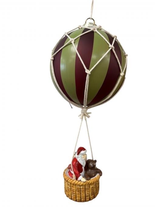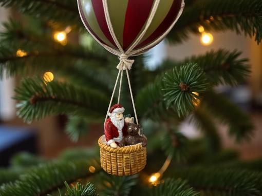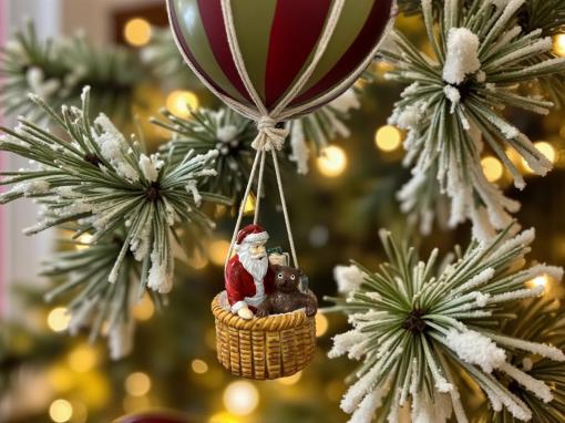 Cette année, le Père Noël a décidé d’éviter les embouteillages aériens… et a troqué son traîneau contre une montgolfière ! Confortablement installé dans son panier en osier, accompagné de son fidèle ours en peluche, il survole le sapin à la recherche du meilleur endroit pour atterrir.