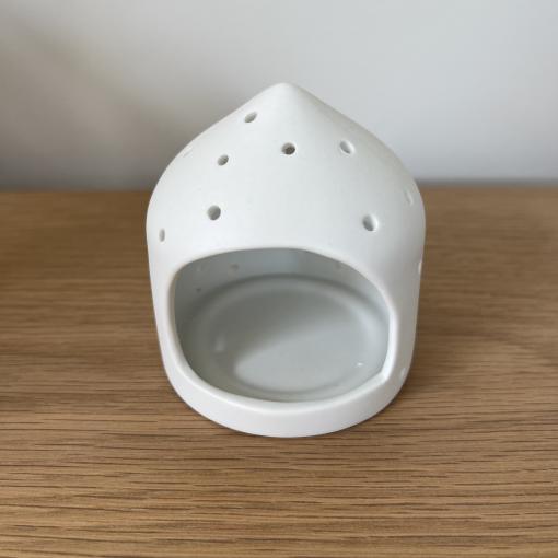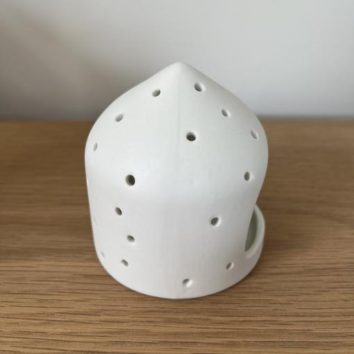 Ce petit photophore en porcelaine, astucieusement conçu avec une ouverture à l'arrière pour accueillir un chauffe-plat, allie fonctionnalité et esthétique. Son motif ajouré délicatement travaillé permet à la lumière de danser à travers ses parois, créant une ambiance chaleureuse et apaisante dans n'importe quel espace. Une pièce parfaite pour ajouter une touche d'élégance et de lumière subtile à votre décoration intérieure.