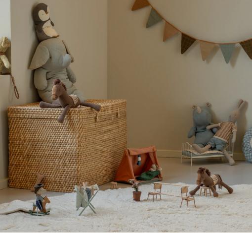 Avec sa robe marron toute douce en coton et lin, ce poney Maileg deviendra vite le fidèle destrier des petits personnages. Sa crinière et sa queue en corde de coton lui donnent un charme rustique, tandis que sa selle en tricot assure des balades confortables. Un compagnon tendre pour des histoires pleines de galop et d’imagination.