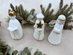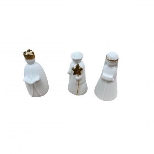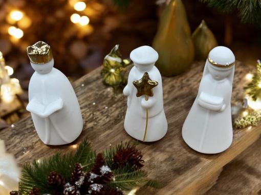 Ce lot de trois santons en porcelaine mat présente des finitions délicates et élégantes. Les détails dorés sur la couronne, l’étoile et la tête apportent une touche festive et raffinée. Ces figurines minimalistes sont parfaites pour une décoration de Noël contemporaine et épurée.