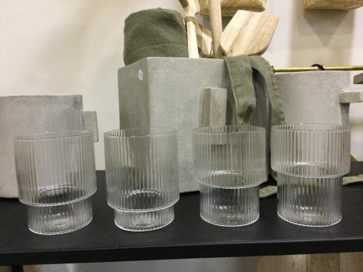 Un ensemble très élégant de 4 verres striés, chaque verre a un pied à une hauteur differente pour une jolie table rétro moderne.