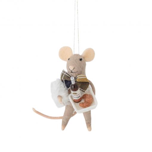 Voici le plus raffiné des serveurs de Noël ! Toujours tiré à quatre épingles avec son nœud papillon chic, notre souris gourmet ne se déplace jamais sans son plateau garni : un petit croissant bien doré et une bouteille de grand cru (en taille souris, évidemment).