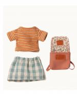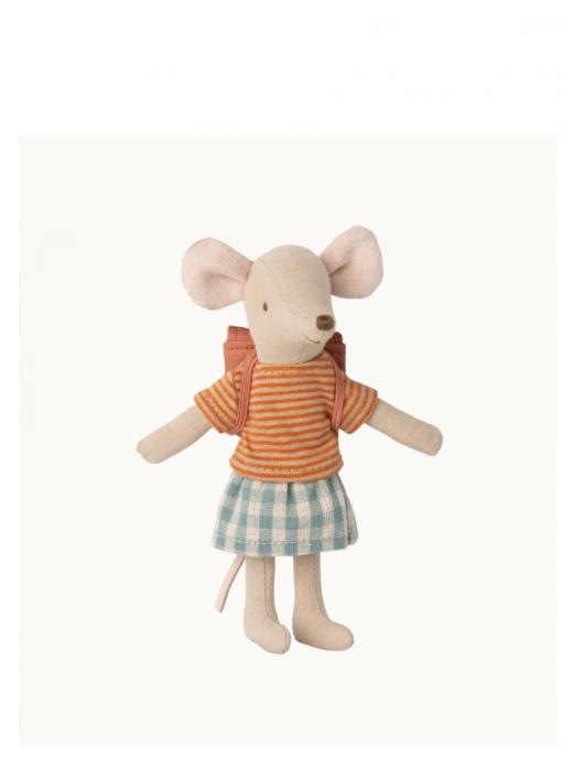 La grande sœur souris est habillée pour une journée au jardin d'enfants ou à l'école, portant son sac à dos sur le dos. Elle a des aimants dans les mains qui lui permettent de tenir les poignées du tricycle pour un voyage rapide.