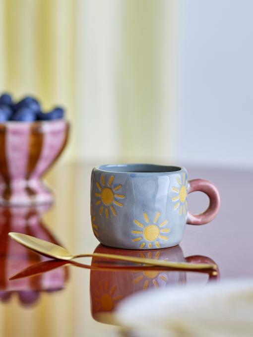 Réalisée en grès, la tasse Nini se distingue par ses motifs solaires délicatement apposés sur une teinte bleutée profonde, contrastée par une anse arrondie rose aux accents chaleureux. Peinte à la main, elle révèle un caractère authentique et singulier. De subtiles variations de motifs et de nuances peuvent apparaître, faisant de chaque tasse une pièce unique, pleine de charme.