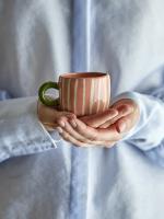 La tasse Nini séduit par son grès à la finition brillante et son anse ronde vert contrasté. Son décor rayé, travaillé en léger relief, révèle de subtiles variations de motif et de teinte, rendant chaque tasse véritablement unique. Les rayures sont façonnées avec soin afin de créer cet effet en creux délicat.